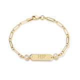 Engrave your name or your favorite person's name on our ID bracelet with a modern minimal rectangle link chain with two bezel set diamonds.