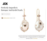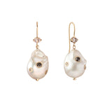 Utilizing Cultured Freshwater Baroque Pearls, embedded with bezel set Salt and Pepper Diamonds and topped with soft pink Morganite for the top stone on the ears, these Pearl earrings have an overall neutral palette suited for any occasion in an updated classic way.