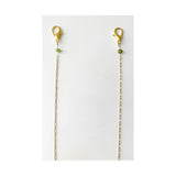 This 30" long brass chain with plated gold have genuine semi-precious Grossular Green Garnet stone beads linked onto the chain on both ends for a subtle pop of color appropriate for brightening up your day as you wear your glasses.