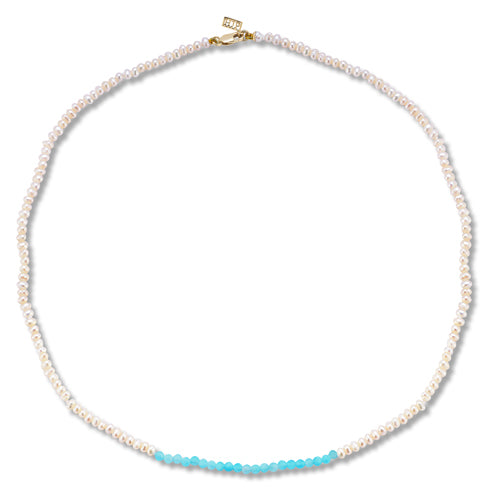 This is no ordinary pearl choker with a pop of color in the form of color block with faceted semi-precious Amazonite stones. A fun layering piece for all seasons if you like to layer your necklaces with beaded pieces and chains.