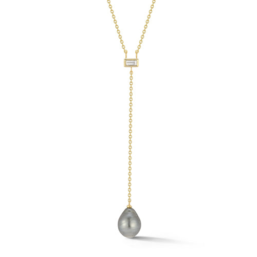 Simple and sophisticated y- necklace with Tahitian pearl. The Tahitian Pearl drops from a baguette diamond at the center of the necklace. Wear it with a v-shape neckline or a button down shirt to enhance the natural feminine and sleek silhouette of your neckline.