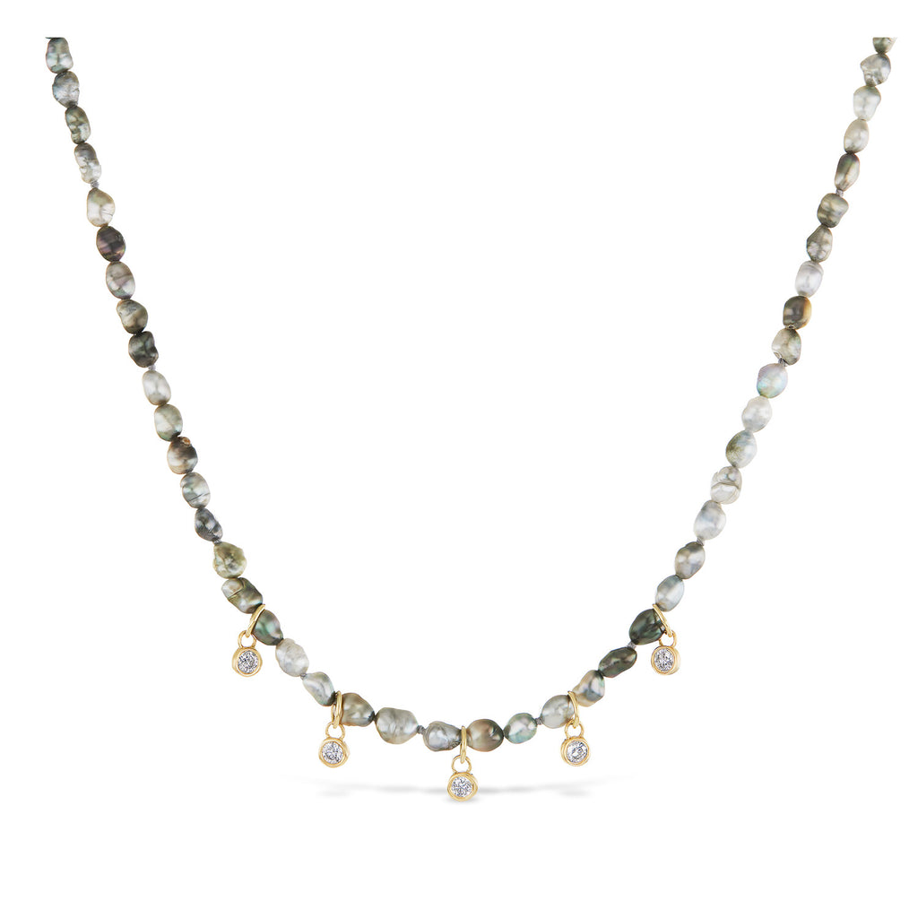 Natural Tahitian small baroque pearls with diamond charms. Knotted every 1" and strung with five diamond charms dangling at the front of the pearls.
