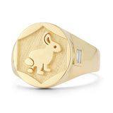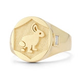 Signet ring designed in mind for cute animal lovers with a little bit of background texture against the polished bunny and diamond baguette side stones. Rabbits are known to symbolize abundance and good fortune. They have extremely sensitive organs and are highly intuitive due to their survival nature. This makes them imaginative and creative, think of the bunny in Alice in Wonderland!