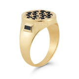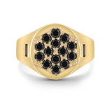 Oval Signet ring with black Diamond Pavè in the shape of a hexagon and diamond baguette side stones.