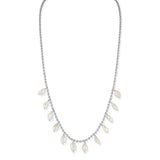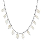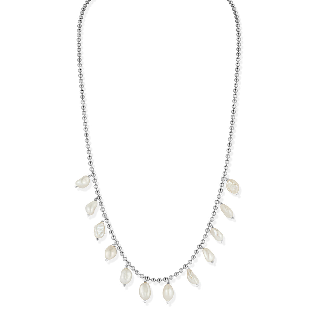 This is a bolder version of the Dewy Tahitian necklace. Made in Silver with a bolder ball chain and beautiful Keshi Baroque pearl drops, this pearl piece looks like you have floating pearls on your neckline. We recommend wearing this necklace with an open neck shirt to enhance the flattering necklace!