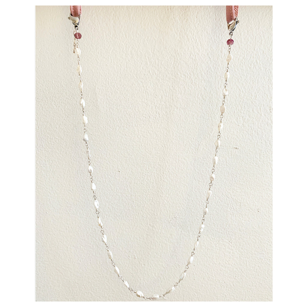 This 23" hand-made sterling silver rosary chain is made with freshwater pearls and accents of tourmaline rondelle stones on each end of the chain. The small petite size of the pearls are subtle and creates a polished look while you wear your glasses.