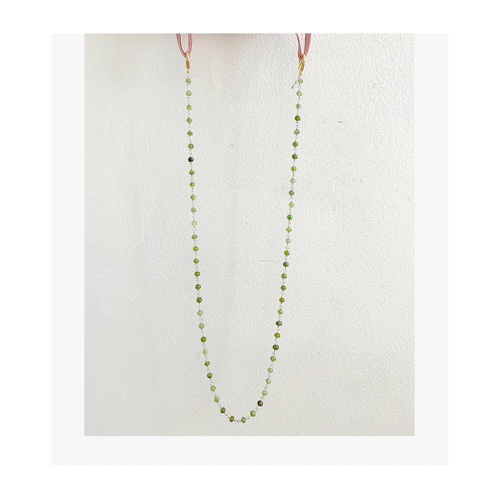 This 30" long hand-made sterling silver rosary chain is made with with genuine semi-precious Green Grossular Garnet rondelle shape stone beads for an all around pop of color appropriate for brightening up your day while you wear your glasses. Grossular Garnet stone signifies hope, empowerment, and all things nurturing derived from Mother nature. It comes in various shades, from yellow to the lush and vibrant greens, it is known to be a stone of prosperity and abundance.
