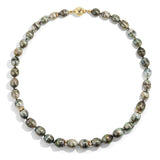 A Jewelry collector's staple piece for their Jewelry Collection. This 18" strand of Natural Tahitian Pearls has four pieces of diamond studded gold beads strung between the pearls to compliment the opulence of the Tahitian pearls.