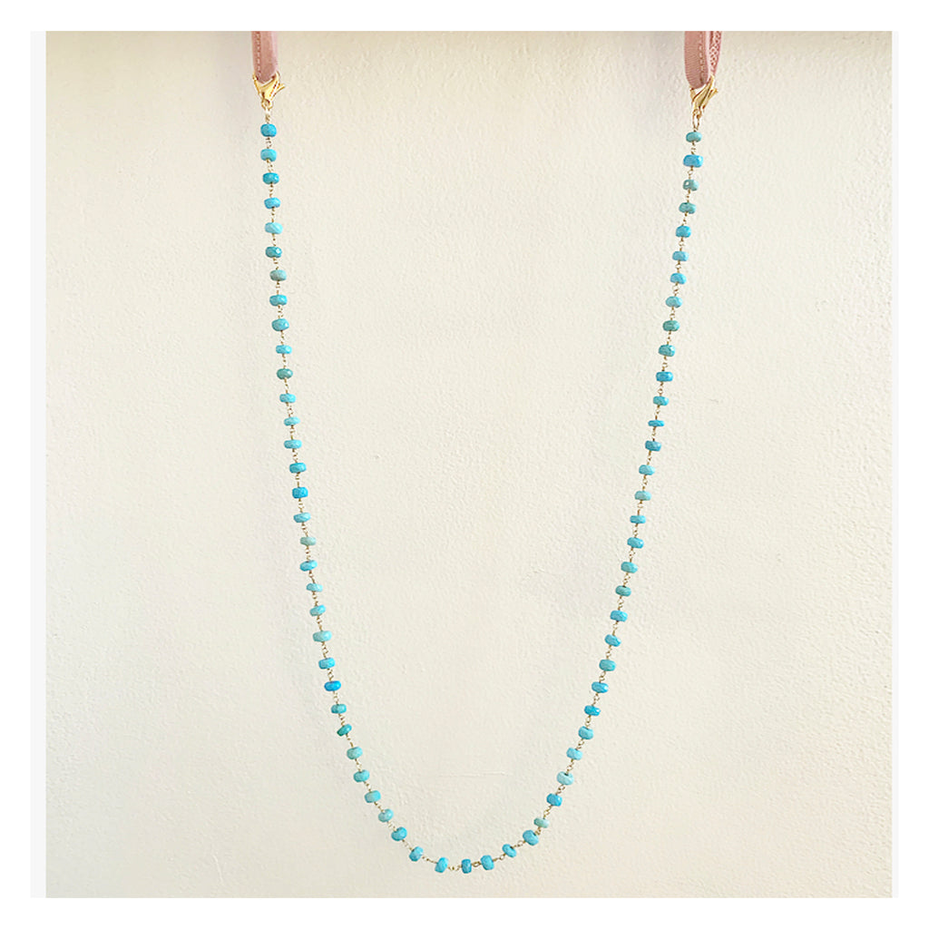 This 26" hand-made vermeil (gold plated over sterling silver) rosary chain is made with Genuine Smooth Turquoise Rondelle shape stones.
