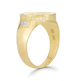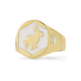 Signet ring designed in mind for cute animal lovers with white enamel and diamond baguette side stones. Rabbits are known to symbolize abundance and good fortune. They have extremely sensitive organs and are highly intuitive due to their survival nature. This makes them imaginative and creative, think of the bunny in Alice in Wonderland!